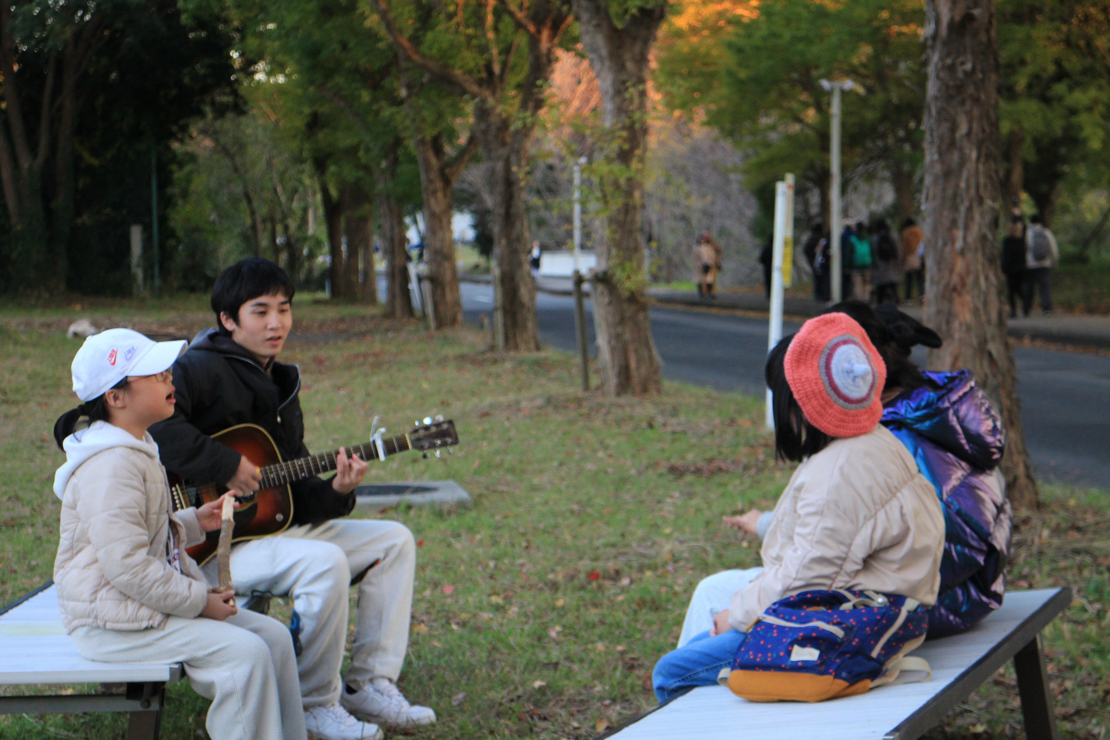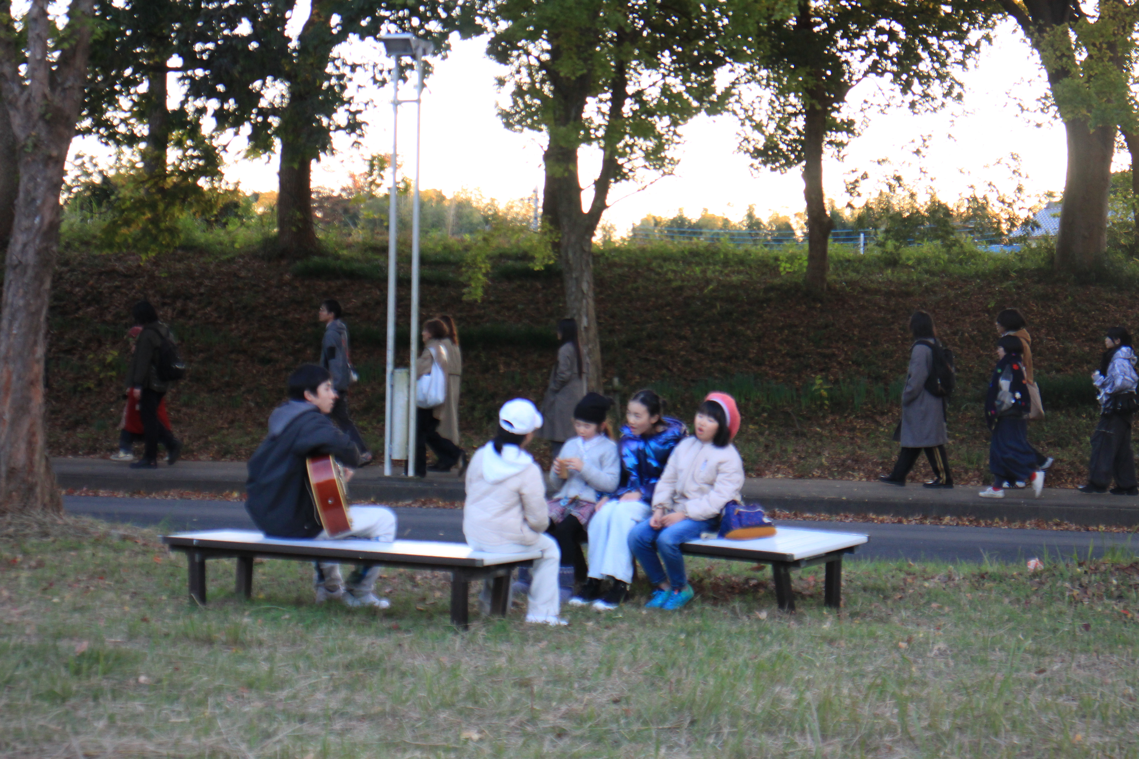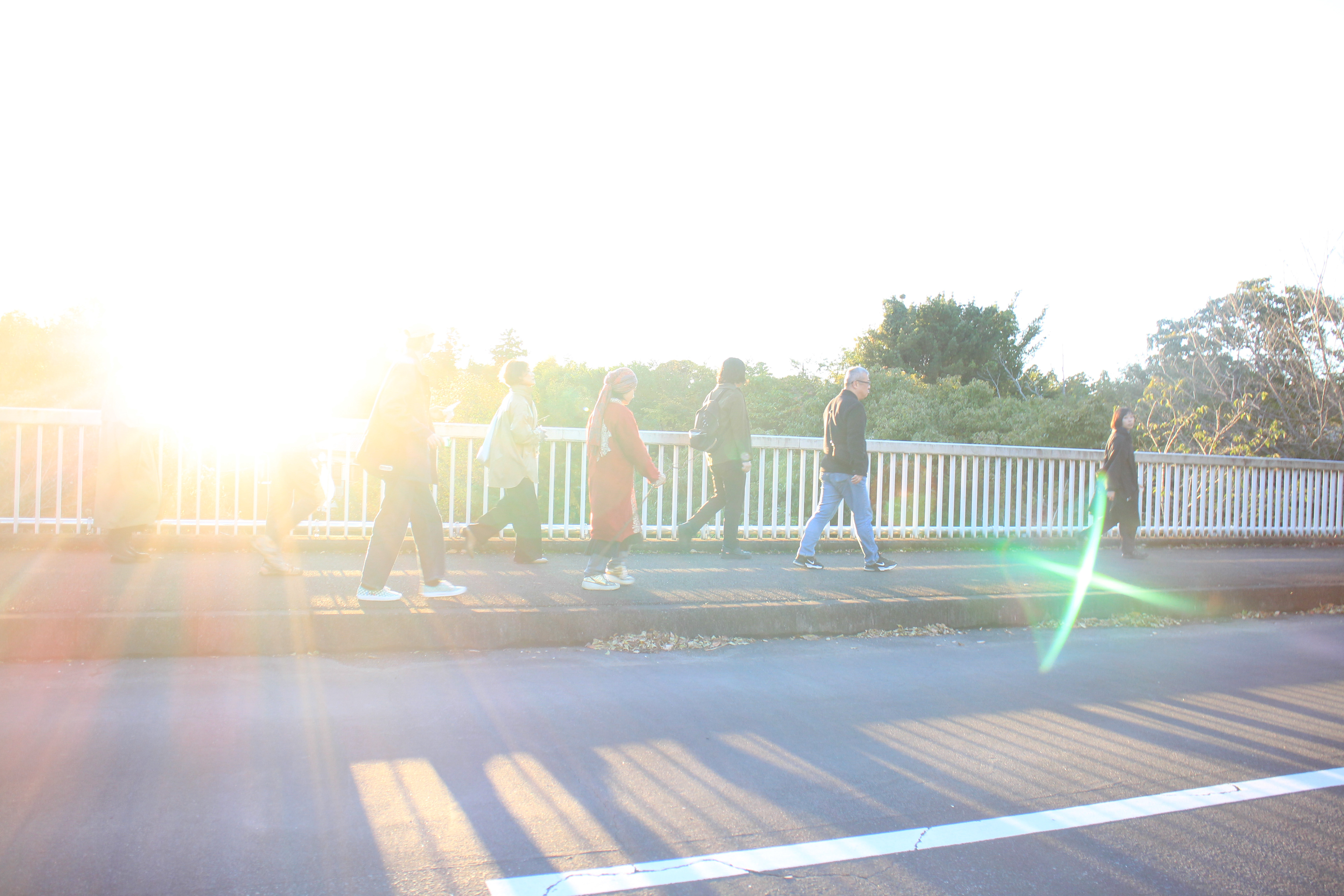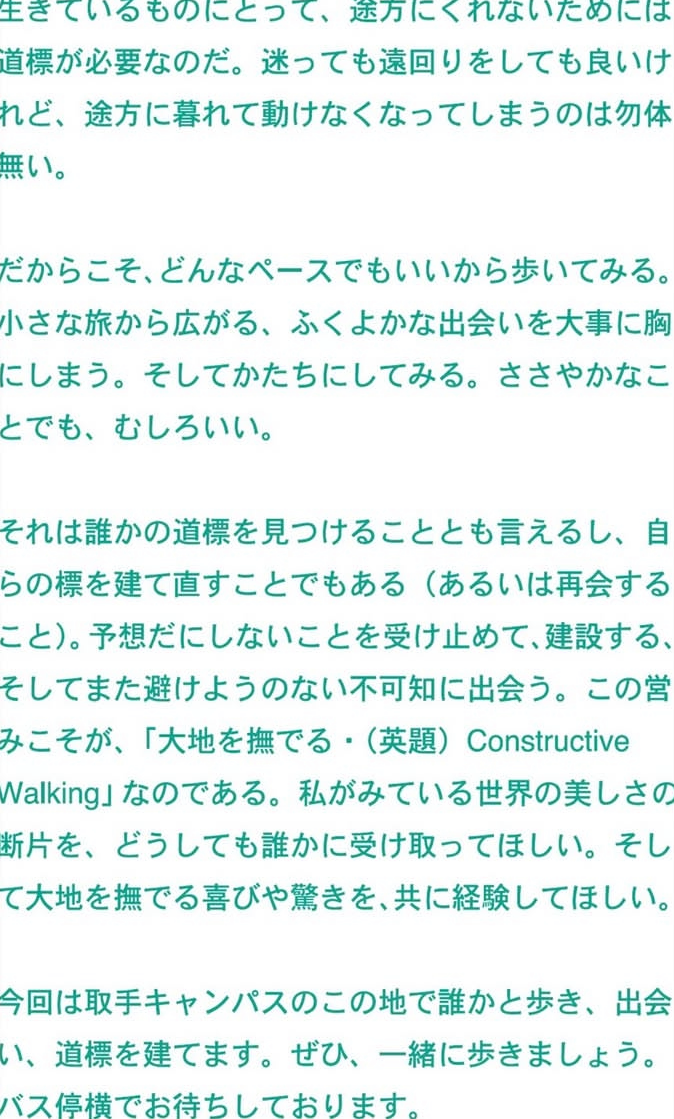 誰も通ったことがないような、取手キャンパスの大地を撫でるように歩くのである。演劇とも言い切れないが会話ともいえない語りを受け、みんなでお茶を飲んだり、最後には偶然なのか否かわからない「カントリーロード」が聴こえたりして、もといた場所に帰っておしまい。これは私の風景を、あなたに見せるための試行錯誤とも言える作品である。